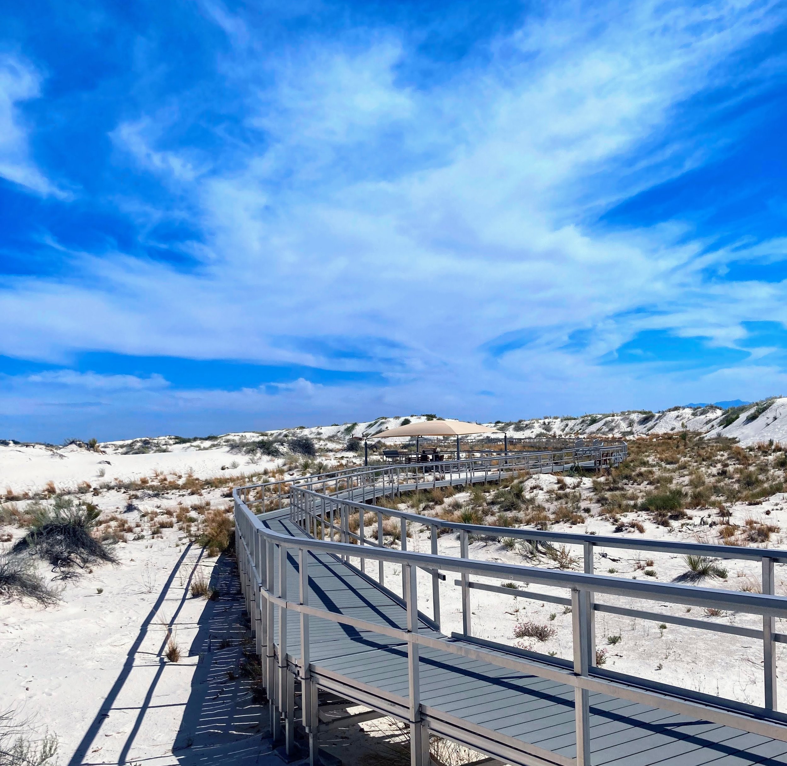 Above all, bring water. Though they do sell it in the visitors center, it is park prices, and you will want to have at least a gallon per person. NOWHERE else in White Sands has water, so do be prepared. The second most important commodity is sunscreen, more so than in most other parks due to the lack of shelter from the sun and intense UV reflection off of the dunes. Sunglasses and a hat are advised, as the lack of shade at White Sands may rank #1 among all National Parks. There is nowhere to hide from the sun, which can get merciless on summer afternoons.